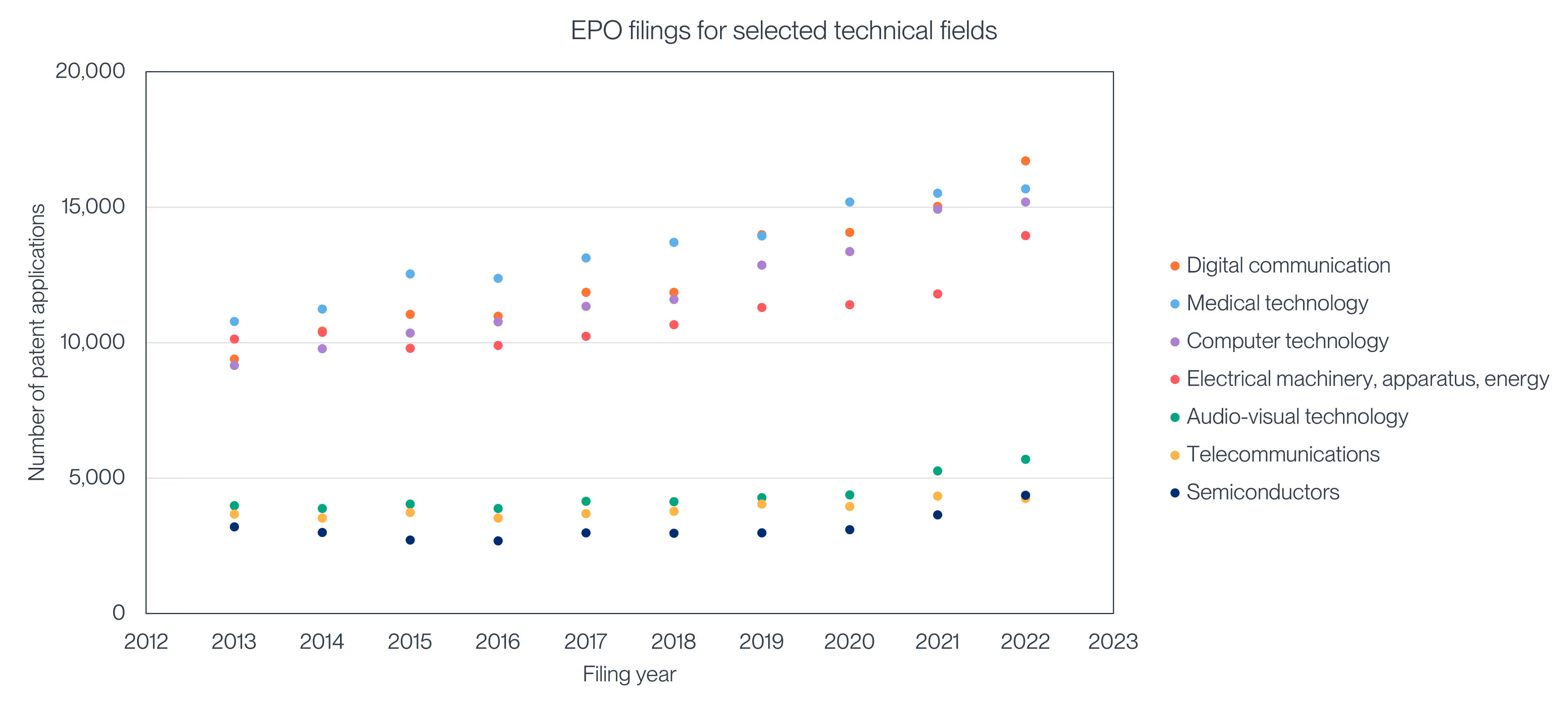 Overall, patent applications to the EPO in 2022 grew by 2.5% compared to 2021, an encouraging figure despite continued economic and geopolitical uncertainty.