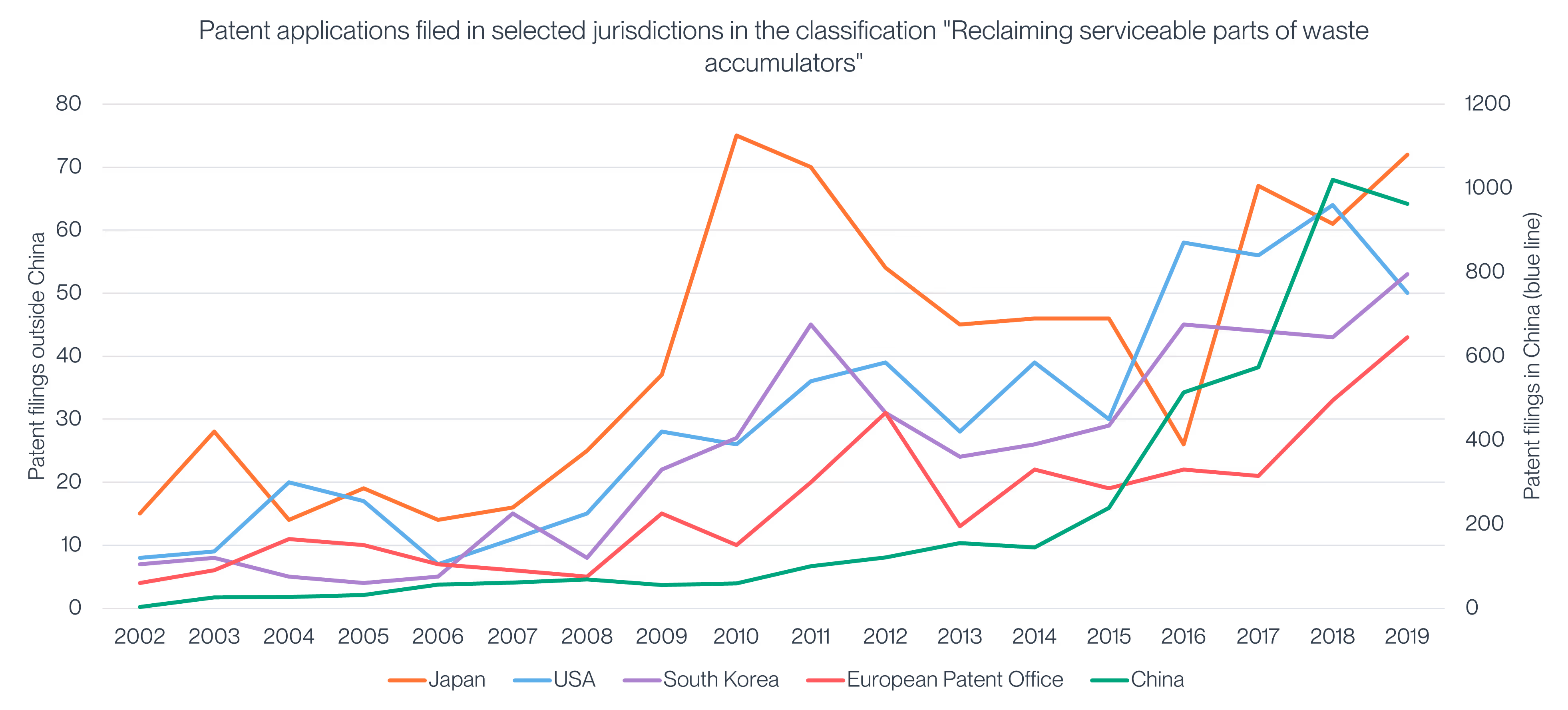 Figure 3 shows number of patent application filings per year in each of Japan, USA, South Korea and at the European Patent Office. The number of patent filings is also shown for China as a black line and is plotted against a different axis to the others given the great disparity in the number of filings in the different jurisdictions.